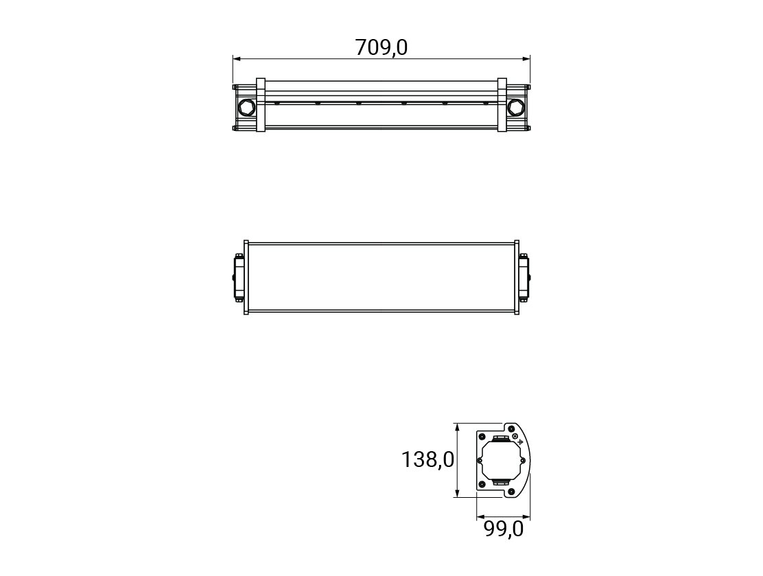 Valaisimen mitat: Pituus: 709 mm, leveys 138 mm, korkeus 99 mm