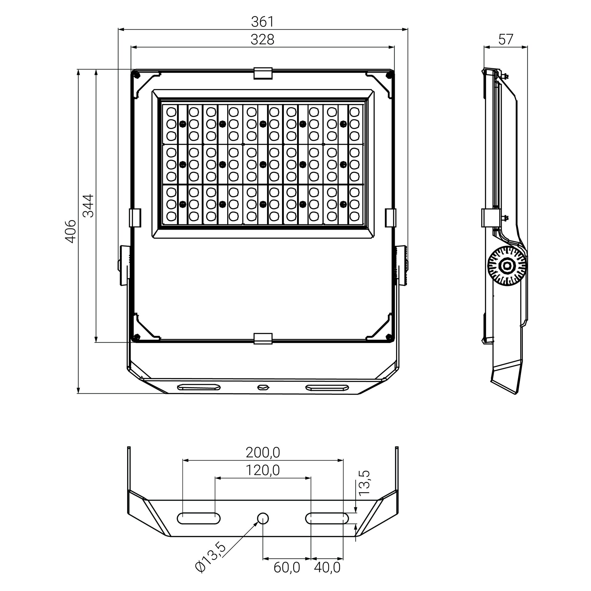 Valaisimen mitat: 361x57x406 mm(LxSxK)