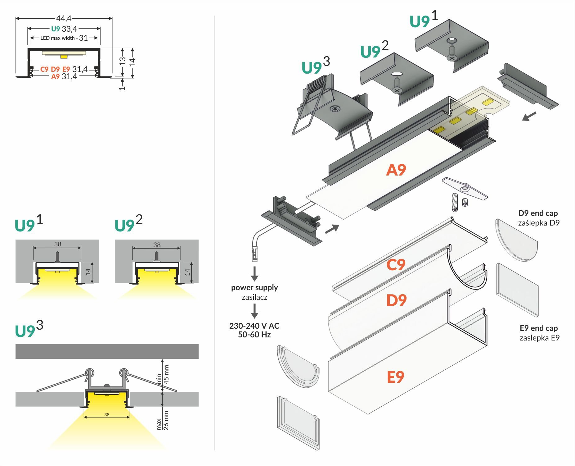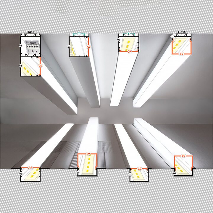 Profiiliin on saatavilla laaja valikoima diffuusoreita, joiden avulla voidaan vaikuttaa profiilin ulkonäköön tai siihen asennetun valonlähteen tuottamaan valokuvioon. Valittavissa ovat matalammat A9-slide- ja C9-click-sarjan ja korkeaprofiilisemmat D9-click- ja E9-click -sarjojen linssit, joista on saatavilla kirkkaita, tummennettuja, himmennettyjä ja opaaleita versioita. Asennuksen viimeistelyä on varten saatavilla erikseen myytäviä päätypaloja, joiden avulla voidaan peittää asennusuran ja profiilin päätyyn jäävät aukot.